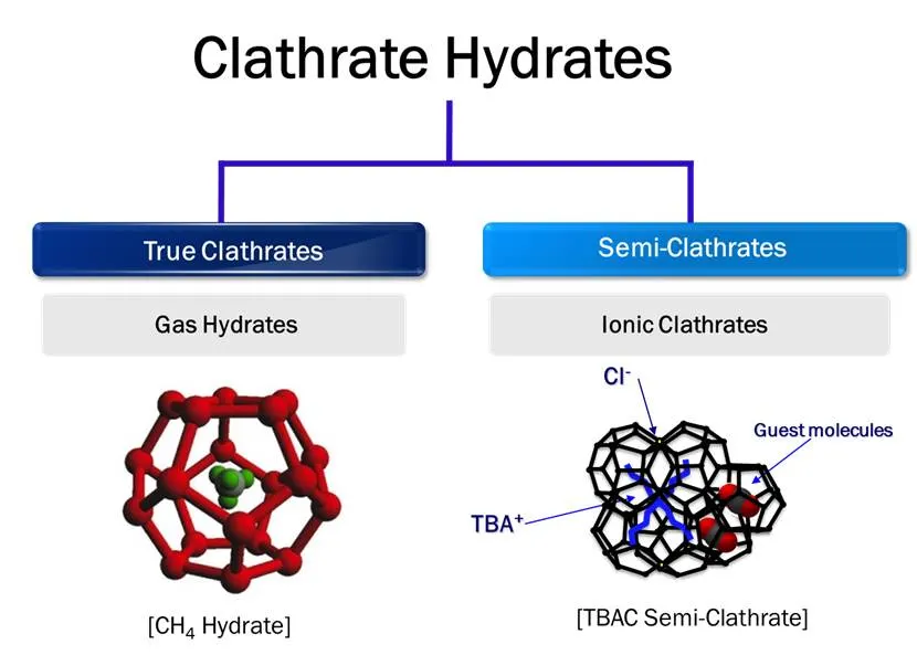 Clathrate hydrates are solid inclusion compounds in which guest molecules are trapped within a crystal structure of water and have many technical applications due to the ability to capture specific gas components. Clathrate hydrates form under certain temperature and pressure conditions in the presence of guest and host molecules. In particular, methane gas hydrate, which is a representative true clathrate, is often called "fiery ice" or "burning ice". The semiclathrates have many physical and structural properties in common with gas hydrates. The main difference is that, in gas hydrates, the guest molecules are not physically bonded to water lattices, while in semiclathrates, guest molecules can both form part of the host lattice and occupy cages after breaking part of the cage structure.