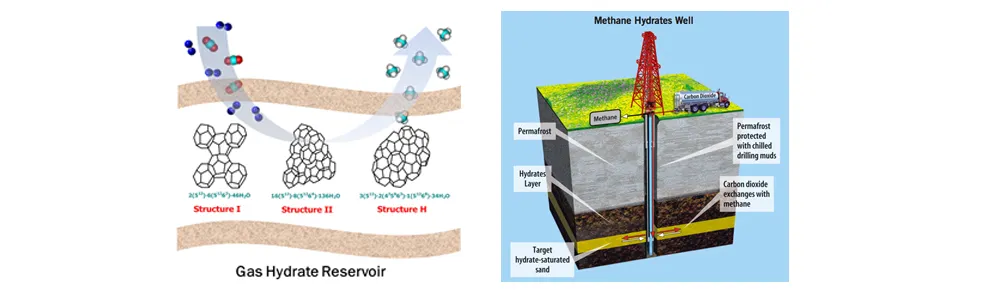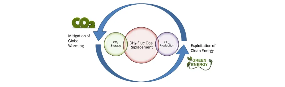 Given that global warming has primarily been attributed to anthropogenic CO₂ emissions, the replacement of CH₄ with CO₂ in the natural gas hydrate reservoirs would function as both effective CH₄ recovery for securing future clean energy and innovative CO₂ storage for mitigating global warming, and also reduce the geo-mechanical hazards that could occur when using conventional production methods such as depressurization and thermal stimulation.